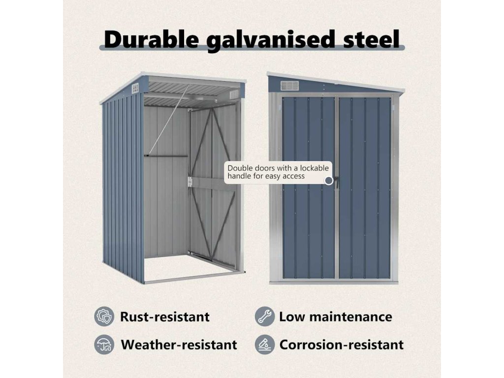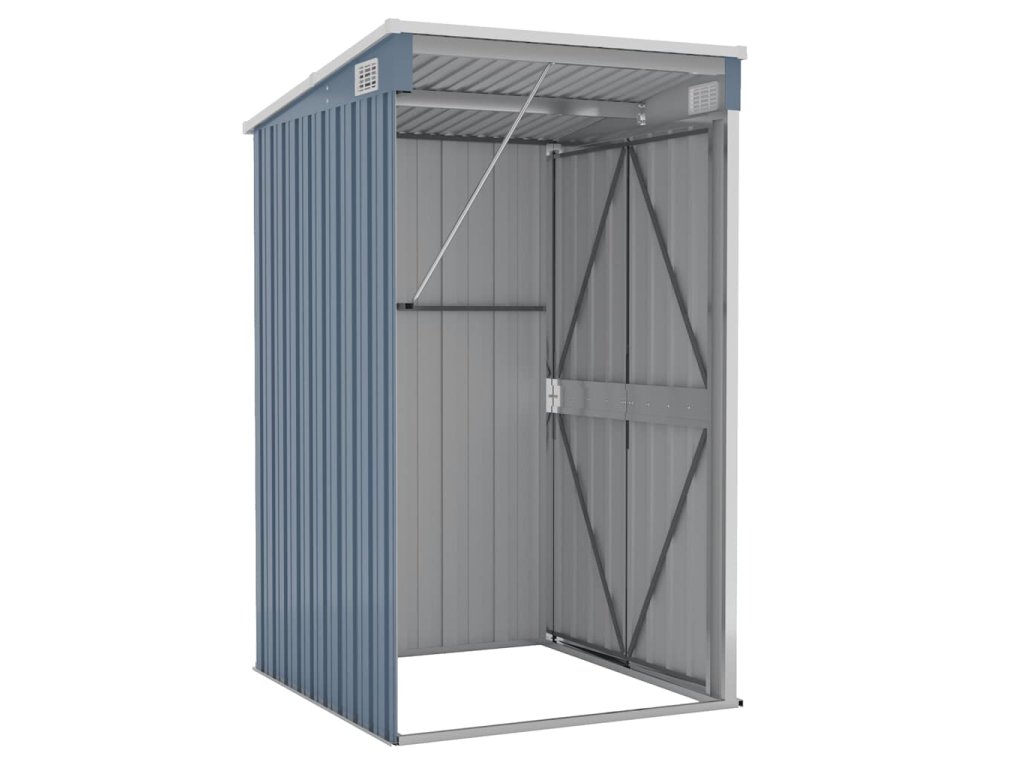 Díky tomu, že je vyroben z pozinkované oceli a kovu, vyžaduje sklad minimální údržbu a je velmi odolný. Dvojité otevírací dveře v přední části umožňují snadný vstup a výstup. Plastová rukojeť s funkcí zámku zajišťuje bezpečnost vašich věcí. Navíc dešťová voda automaticky odtéká ze střechy díky šikmé konstrukci.
