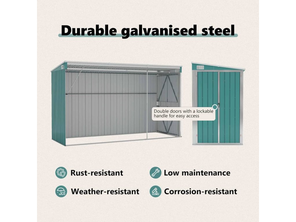 Díky tomu, že je vyroben z pozinkované oceli a kovu, vyžaduje sklad minimální údržbu a je velmi odolný. Dvojité otevírací dveře v přední části umožňují snadný vstup a výstup. Plastová rukojeť s funkcí zámku zajišťuje bezpečnost vašich věcí. Navíc dešťová voda automaticky odtéká ze střechy díky šikmé konstrukci.