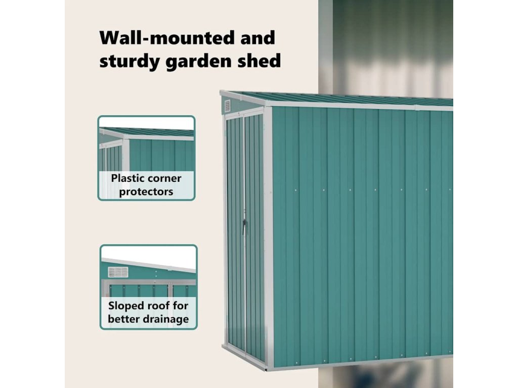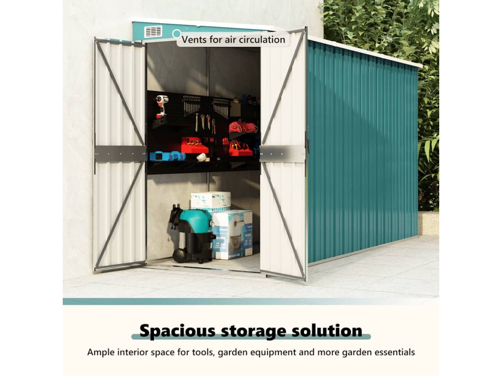 Tento nástěnný zahradní domek je ideální pro uložení různých předmětů, jako je nářadí, zahradní nábytek, zahradní vybavení atd. Domek nabízí ochranu před nečistotami, prachem a také před silným větrem a povětrnostními vlivy.