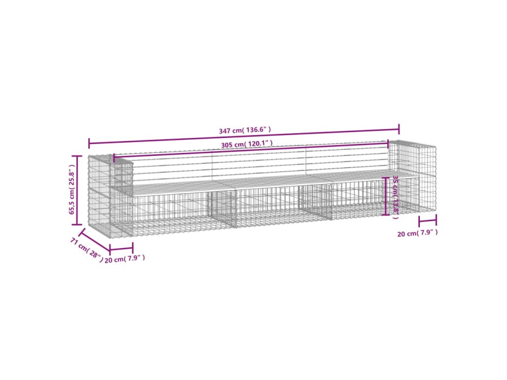 - Robustní a stabilní základna: Venkovní lavice je vybavena základnou z pozinkovaného ocelového gabionového koše, který je navržen tak, aby jej bylo možné naplnit kameny a štěrkem pro atraktivnější vzhled. Mřížku gabionového koše tvoří podélné a svislé drátky, které jsou navíc v každém spoji svařené pro lepší stabilitu.
