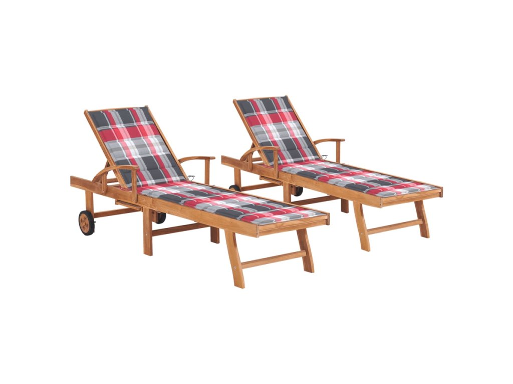 Zahradní lehátka 2 ks červená károvaná poduška masivní teak 3073199