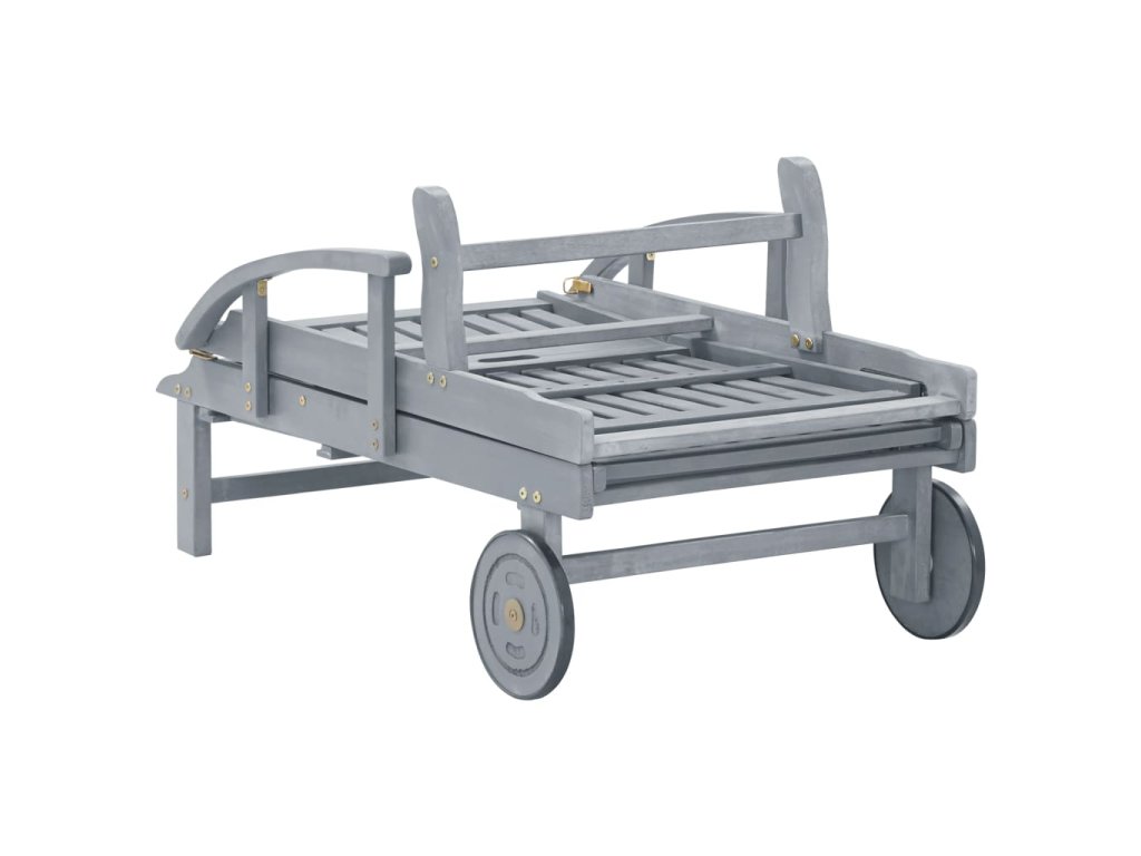 Toto zahradní lehátko je vyrobené z masivního akáciového dřeva s šedou povrchovou úpravou, takže je robustní a stabilní. Opěrky zad a nohou jsou polohovatelné a můžete je snadno nastavit do požadované polohy. Toto zahradní lehátko se 2 kolečky snadno přemístíte, kamkoliv potřebujete. Lehátko je vybavené praktickým výsuvným stolkem, na který můžete položit telefon, sluneční brýle, pití a další drobné předměty. Polštářek přispívá k optimálnímu komfortu během vaší relaxace. Každá poduška je vybavená dvěma páry šňůrek, abyste ji mohli pevně zafixovat k lehátku.