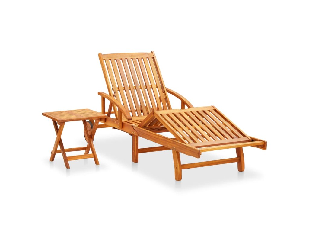 Zahradní lehátko i stolek jsou vyrobené z masivního akáciového dřeva, takže jsou bytelné a stabilní. Lehátko má 2 kolečka, po kterých se dá snadno přemisťovat. Opěradlo a opěrka nohou jsou nastavitelné, abyste si ho mohli zajistit v požadované poloze. Výsuvný odkládací stolek je perfektním místem pro telefon, sluneční brýle, nápoje a další drobné předměty. Poduška přináší extra dávku komfortu pro chvíle odpočinku. Každou podušku můžete k lehátku pevně přivázat šesti páry provázků.