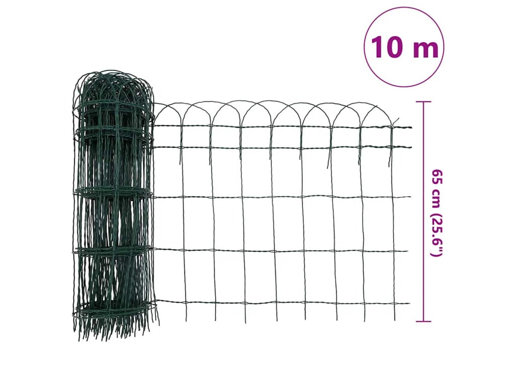 Tento stylový rozvinovací plot s délkou 10 m je určen k ochraně hranic vaší zahrady nebo lemů trávníku. Naše ohraničení je z kvalitního materiálu, který je odolný vůči klimatickým vlivům a vodě a plotu zajišťuje dlouhou životnost. Tento dekorativní plot pomáhá udržovat vaši zahradu čistou a uklizenou a také zdůrazňuje krásu vašich záhonů nebo lemů trávníku. Konstrukce z železných drátů účinně chrání záhony před zvířaty a rostliny na nich před nezvanými strávníky. Tento hraniční plot se dá snadno upevnit špičatými konci do země, což zvyšuje jeho bezpečnost a stabilitu.
