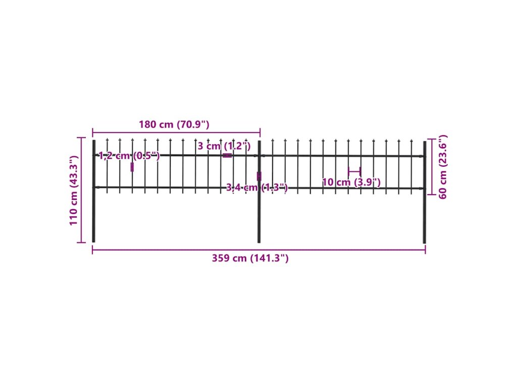 Zahradní plot s kopím nahoře ocelový 359 x 60 cm černý 277594