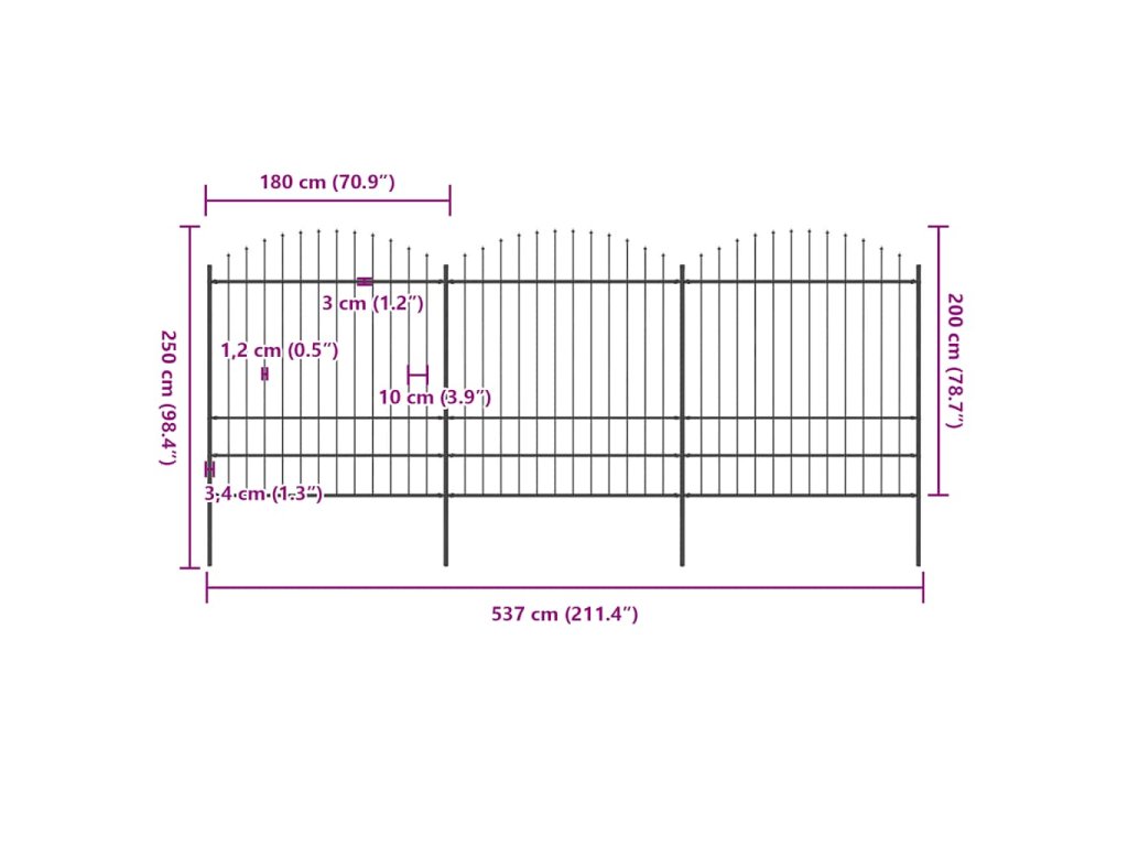 Plot je vyroben z vysoce odolné oceli, je tudíž mimořádně stabilní, pevný a odolný. Svislé pruty jsou nahoře zakončené hroty a silné vodorovné tyče slouží ke zpevnění rámu, aby vám oplocení poskytlo vysokou úroveň bezpečí a soukromí. Sestavení plotu je jednoduché.