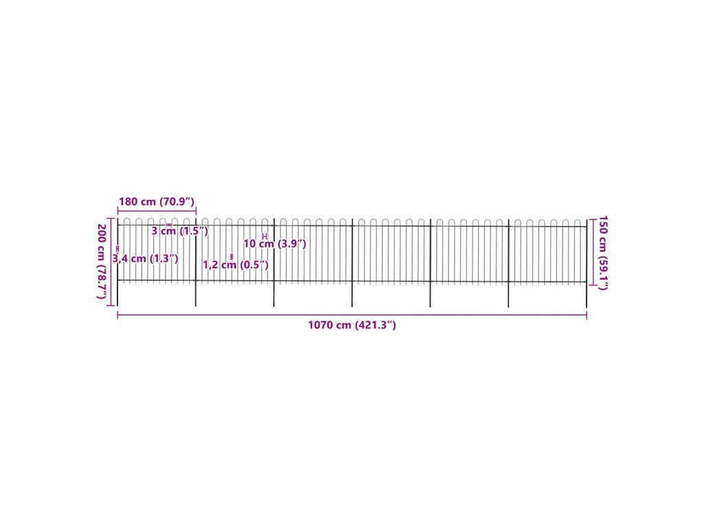 Zahradní plot s obloukem nahoře ocelový 1070 x 150 cm černý 277679