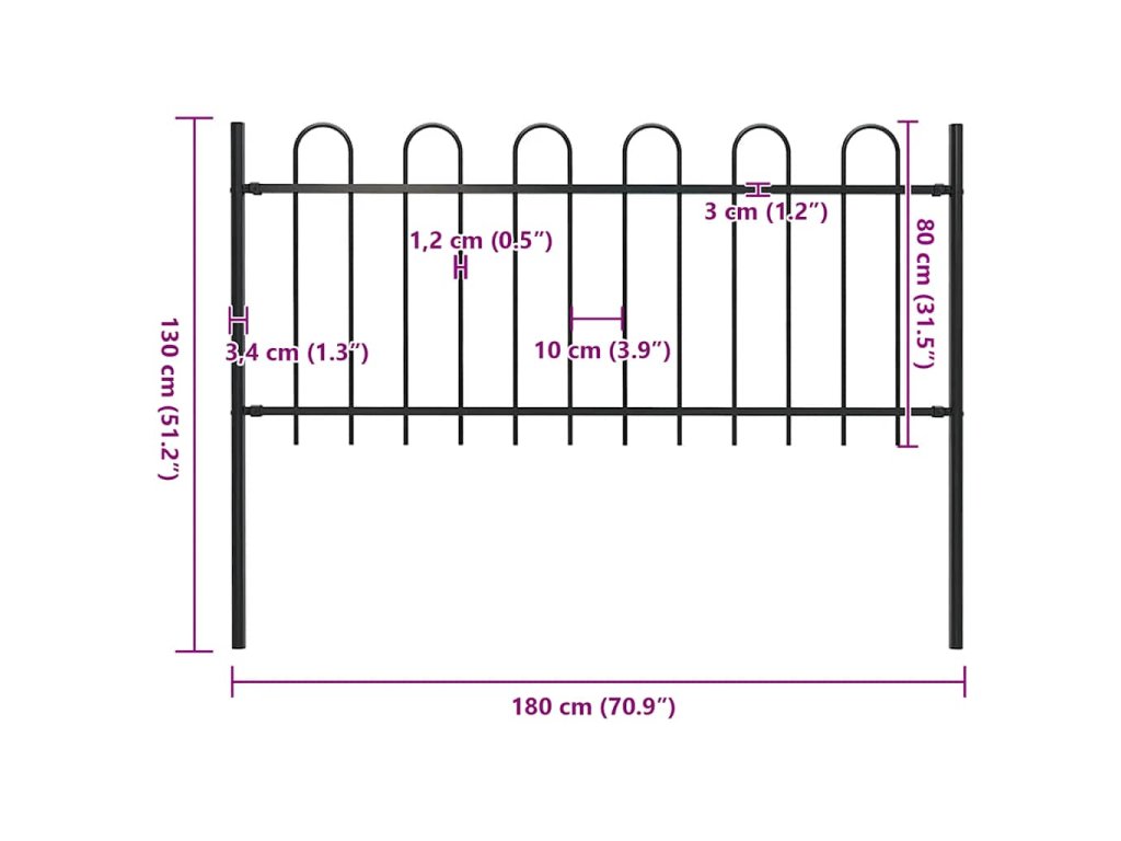 Vytvořte si okolo vaší zahrady, domu nebo příjezdové cesty elegantní oplocení s naším dekorativním zahradním plotem s obloučky! Je vyroben z oceli a má celkovou délku 1,8 metrů. Pomůže vám okolo vaší zahrady, domu, komerčního pozemku nebo výběhu pro zvířata vztyčit robustní bariéru.