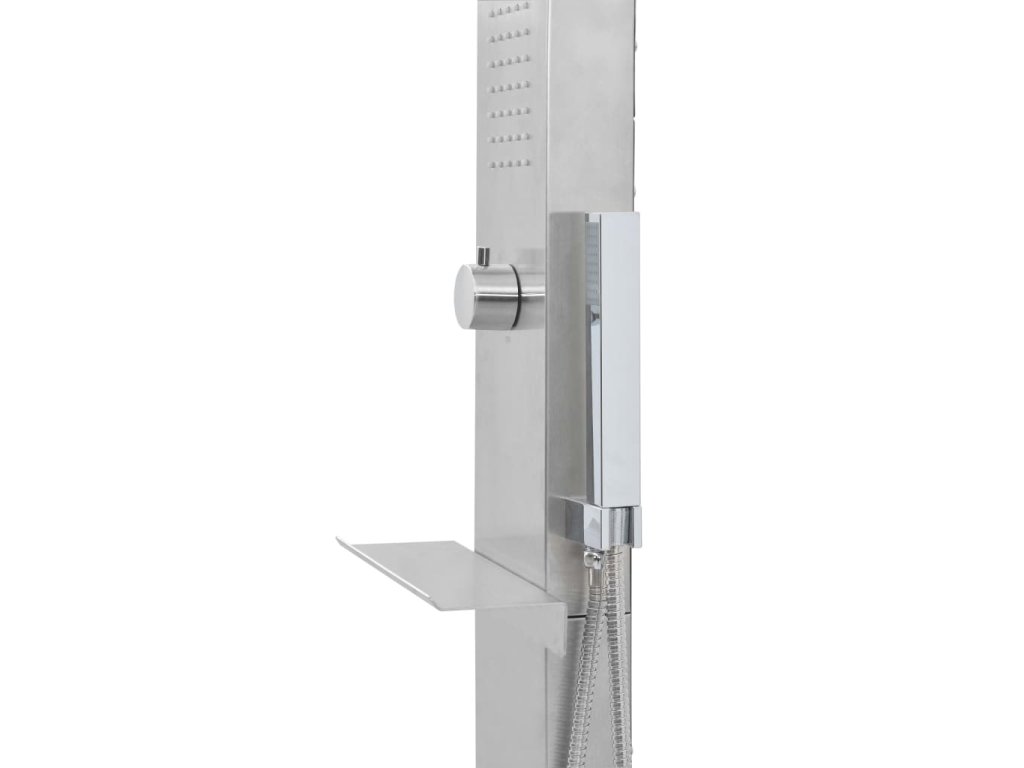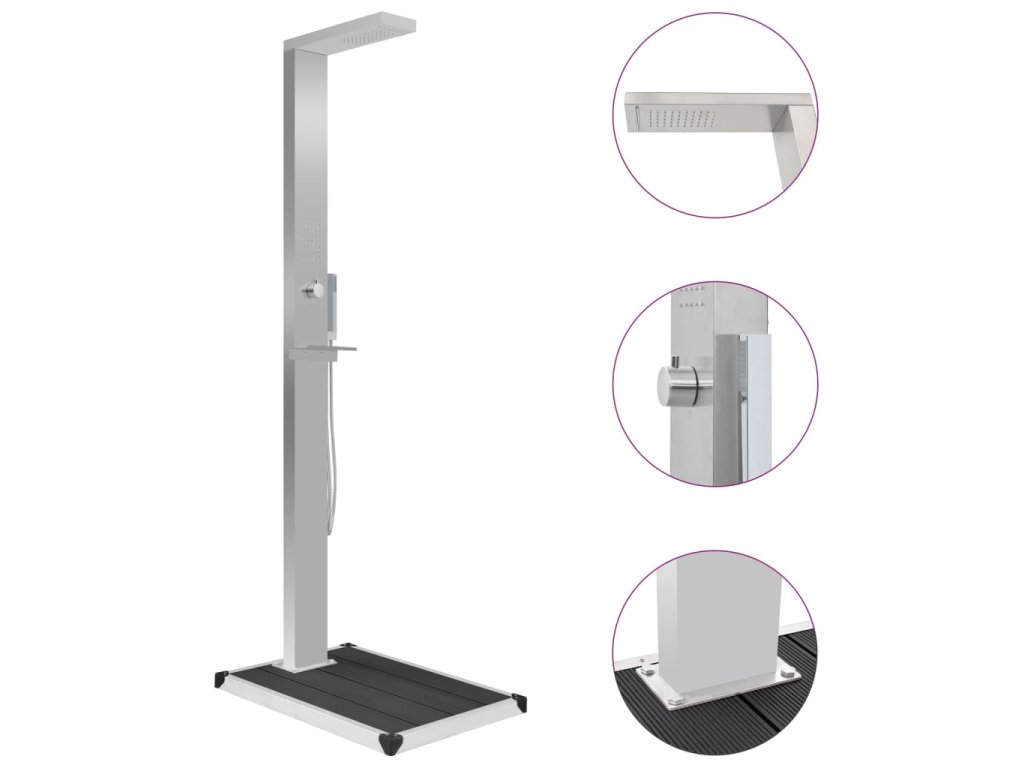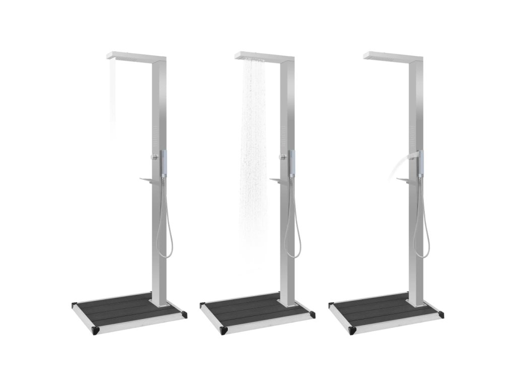 Náš multifunkční sprchový panel má stylový design. V kombinaci s elegantní sprchovou vaničkou bude skvělým doplňkem k vašemu bazénu či do jiných venkovních prostor.