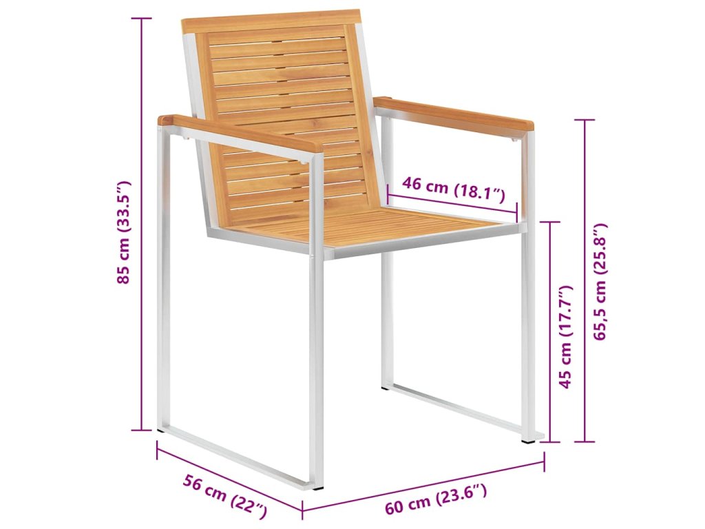 Nábytek je zhotovený z extrémně odolného teakového tvrdého dřeva, které již prošlo procesem smršťování, bylo uměle vysušené a poté jemně a dohladka obroušené. Teakové dřevo je oceňované pro svou výjimečnou pevnost a klimatickou odolnost, a proto je jedním z nejoblíbenějších materiálů pro výrobu zahradního nábytku. Je to skvělá volba, pokud si chcete pořídit venkovní výbavu, která vám vydrží sloužit dlouhá léta. Vzhledem k rámu z vysoce kvalitní nerezové oceli jsou židle zároveň robustní a odolné vůči korozi. Přiložená poduška slouží nejen jako praktický doplněk – plní také dekorativní funkci. Posaďte se a dopřejte si venku skvělou večeři nebo si jen tak odpočiňte a užívejte si počasí s touto klasickou sadou zahradních židlí.