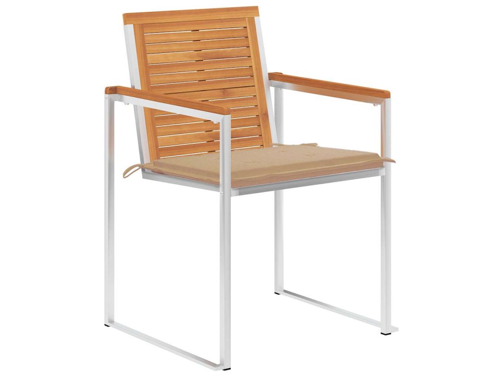 Jídelní židle jsou vyrobeny z masivního akáciového dřeva a vysoce kvalitní nerezové oceli, takže jsou vysoce odolné, nerezavějící, robustní a snadno se čistí vlhkým hadříkem. Přiložená poduška je více než jen praktickým doplňkem, plní také dekorativní funkci. Posaďte se k příjemné večeři pod širým nebem nebo jen relaxujte a užívejte si počasí s touto klasickou sadou zahradních židlí.