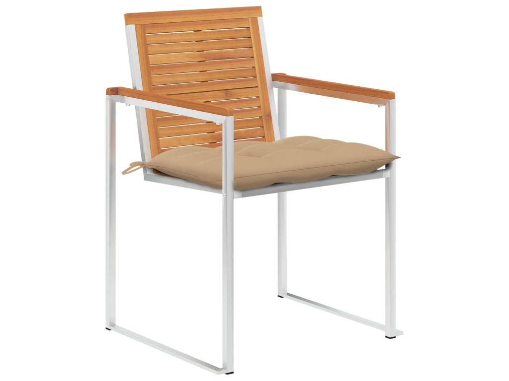 Jídelní židle jsou vyrobené z masivního akáciového dřeva a prvotřídní nerezové oceli. Proto mají dlouhou životnost, jsou odolné vůči rzi, robustní a snadno se čistí vlhkým hadříkem. Podušky, jež jsou více než jen praktický doplněk, mají také dekorativní funkci. Usaďte se k chutné večeři na zahradě nebo odpočívejte a užívejte si počasí s touto sadou klasických zahradních židlí.