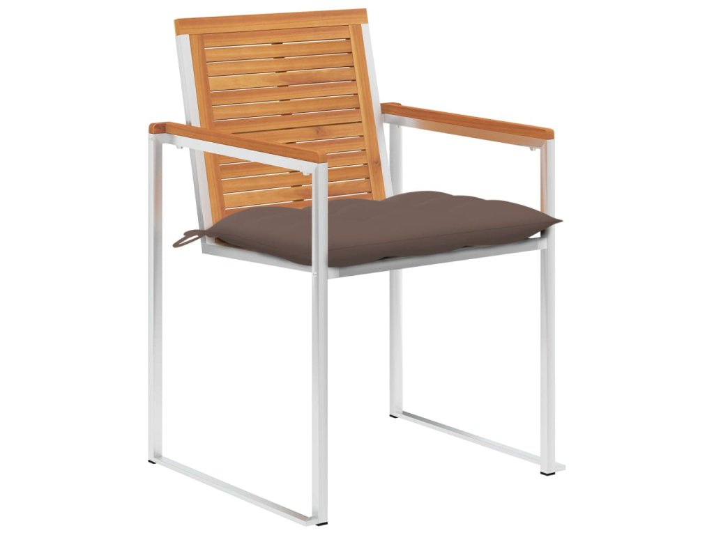 Jídelní židle jsou vyrobené z masivního akáciového dřeva a prvotřídní nerezové oceli. Proto mají dlouhou životnost, jsou odolné vůči rzi, robustní a snadno se čistí vlhkým hadříkem. Podušky, jež jsou více než jen praktický doplněk, mají také dekorativní funkci. Usaďte se k chutné večeři na zahradě nebo odpočívejte a užívejte si počasí s touto sadou klasických zahradních židlí.