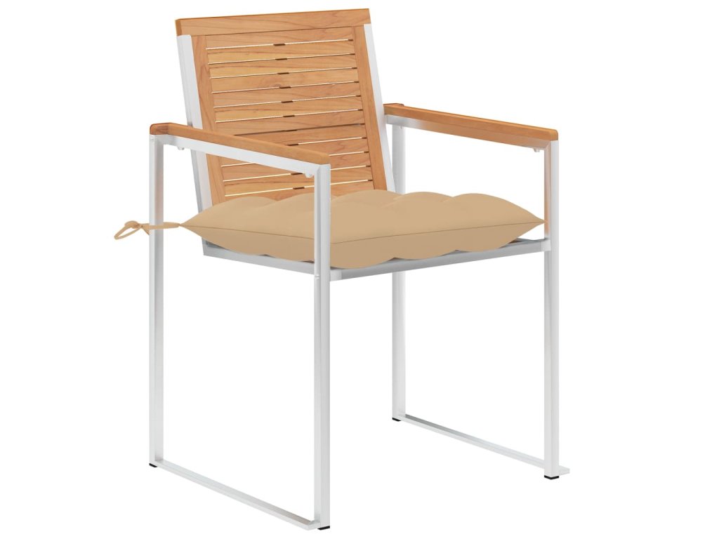 Nábytek je zhotovený z extrémně odolného teakového tvrdého dřeva, které již prošlo procesem smršťování, bylo uměle vysušené a poté jemně a dohladka obroušené. Teakové dřevo je oceňované pro svou výjimečnou pevnost a klimatickou odolnost, a proto je jedním z nejoblíbenějších materiálů pro výrobu zahradního nábytku. Je to skvělá volba, pokud si chcete pořídit venkovní výbavu, která vám vydrží sloužit dlouhá léta. Vzhledem k rámu z vysoce kvalitní nerezové oceli jsou židle zároveň robustní a odolné vůči korozi. Přiložená poduška slouží nejen jako praktický doplněk – plní také dekorativní funkci. Posaďte se a dopřejte si venku skvělou večeři nebo si jen tak odpočiňte a užívejte si počasí s touto klasickou sadou zahradních židlí.