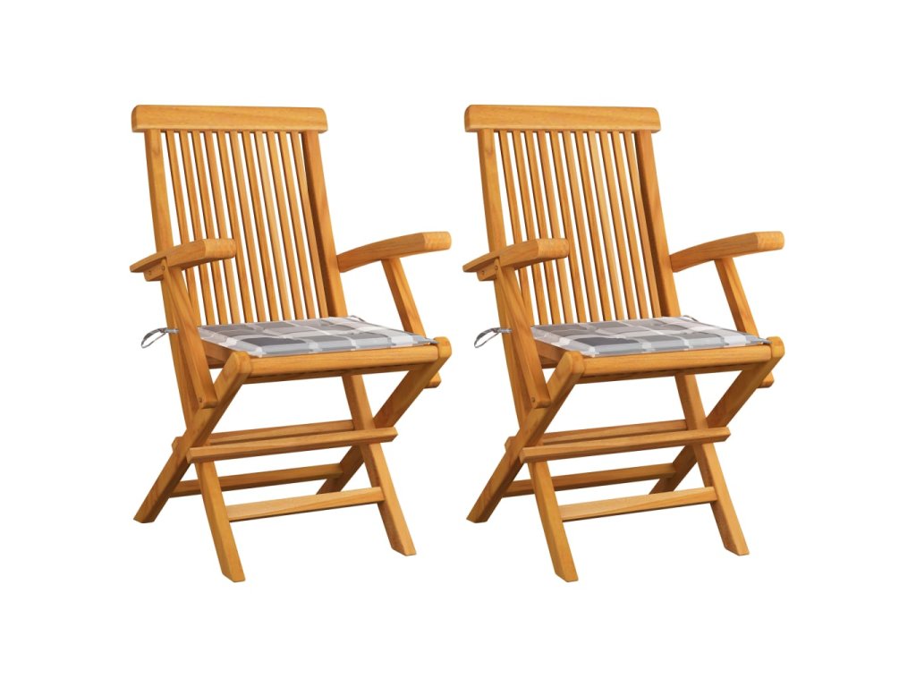 Zahradní židle s šedými károvanými poduškami 2 ks masivní teak 3062501
