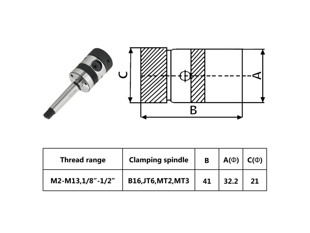Proměňte svou stolní frézku nebo soustruh na závitořezné zařízení s tímto nástrojem. Tato sada obsahuje závitořezné sklíčidlo B16 s trnem MT2. Je určené k řezání vnitřních závitů na vyvrtávačkách, revolverových soustruzích a podobných zařízením. Může vyřezávat závity M2–M13.