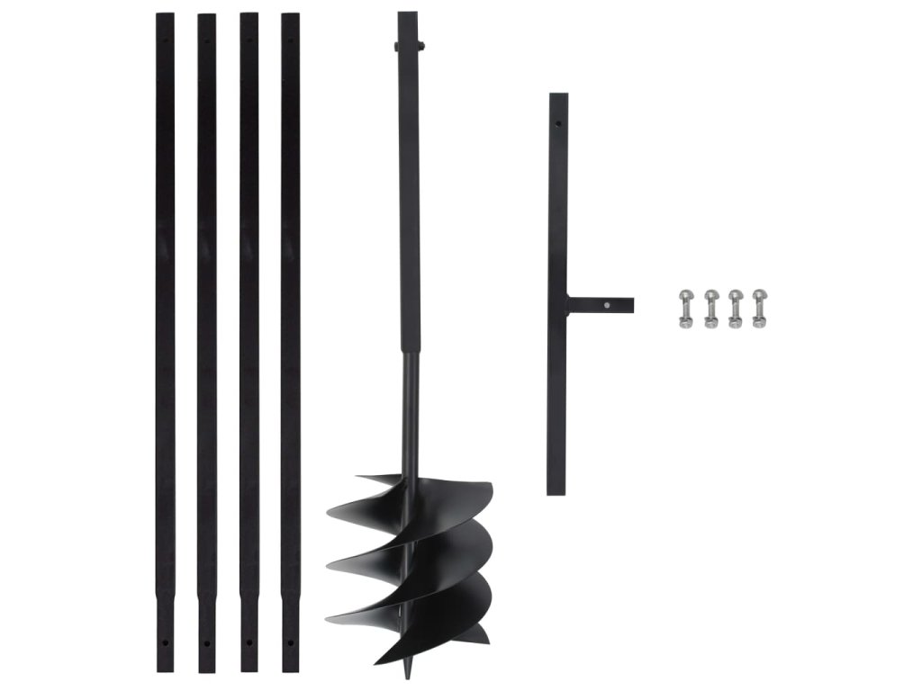 Balení obsahuje zemní vrták, rukojeť, 4 prodlužovací trubky a několik šroubů.