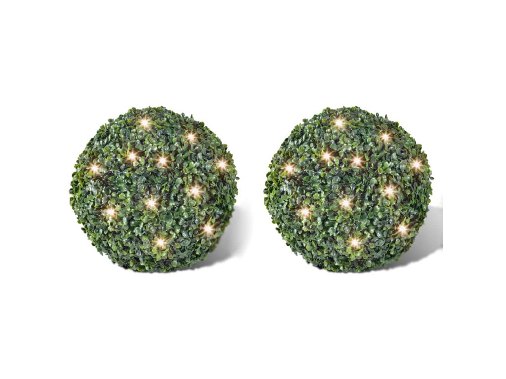 Tento set 2 zimostrázových koulí, který je dodáván se 2 ks solárních světelných řetězů je vhodný jak pro vnitřní, tak pro venkovní použití. Tento set zimosrázových koulí, který můžete umístit do květináče nebo zavěsit, upoutá pozornost a oživí Váš interiér nebo vylepší vzhled Vaší zahrady. Je vyroben z vysoce kvalitního plastu, je odolný proti vodě a je vhodný pro dlouhodobé venkovní použití. Má svěží mix zelených barev a přírodní texturu a přestože je umělý, rozhodně vypadá opravdově. Solární světelný řetěz měří 3,8 m a má 24 LED žárovek. Během dne solární panely uchovávají solární energii v dobíjecí baterii. V noci se automaticky rozstvítí za pomoci nastřádané energie. Tento set zimostrázů s řetězem, který vydává tepé bílé světlo, dokáže vytvořit uvolněnou a příjemnou atmosféru.