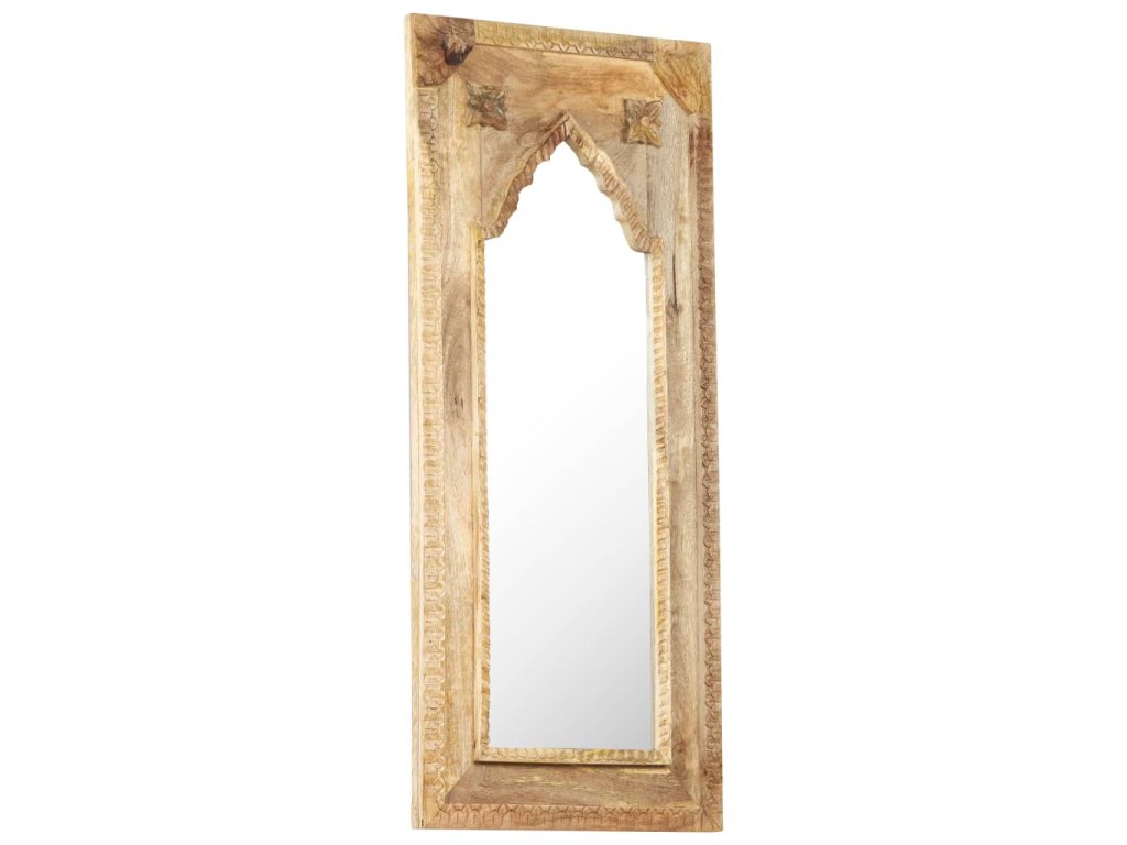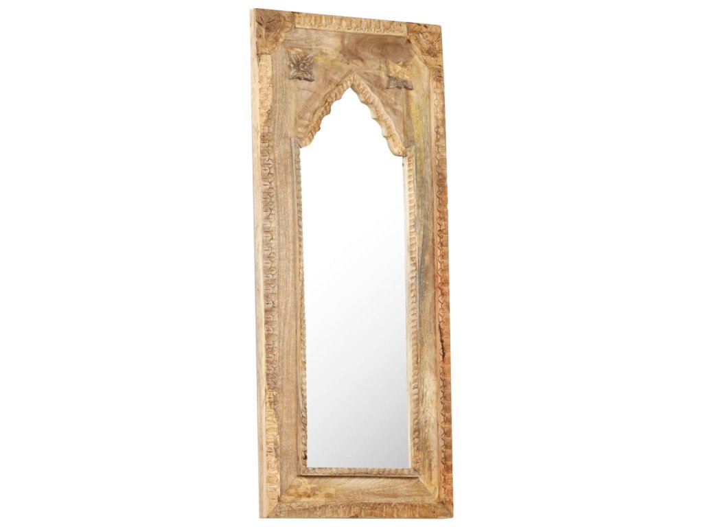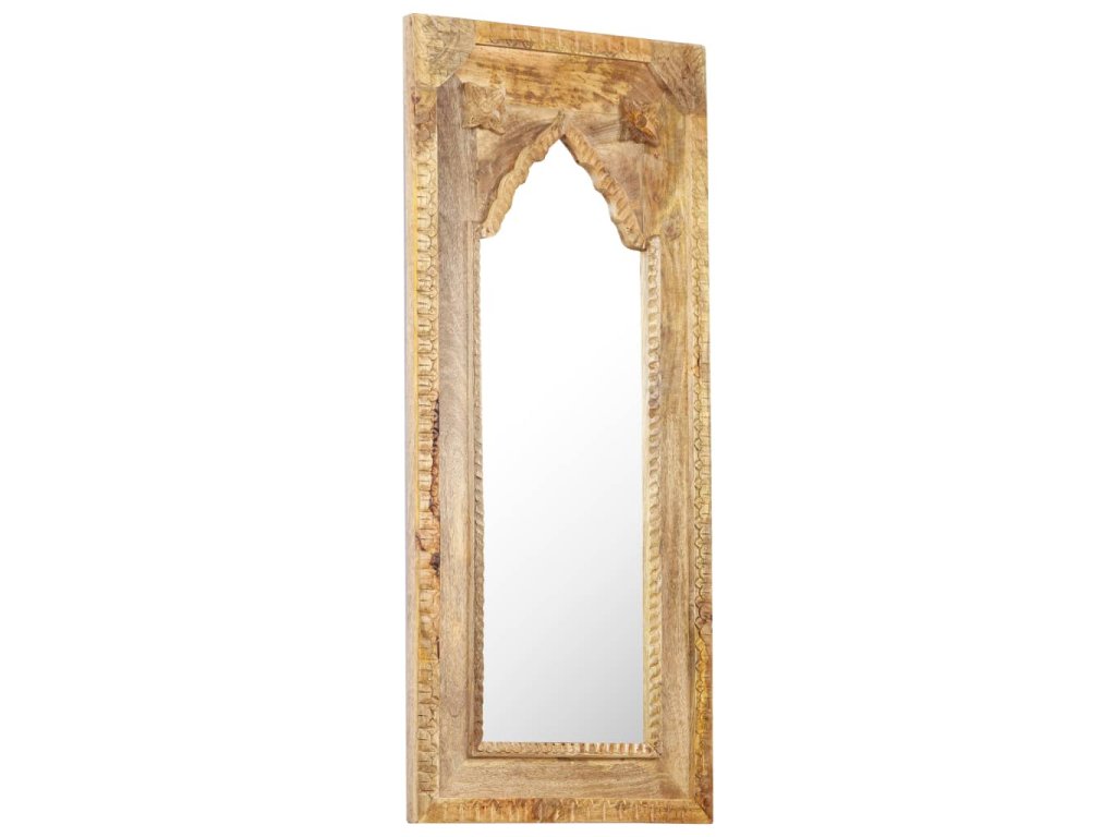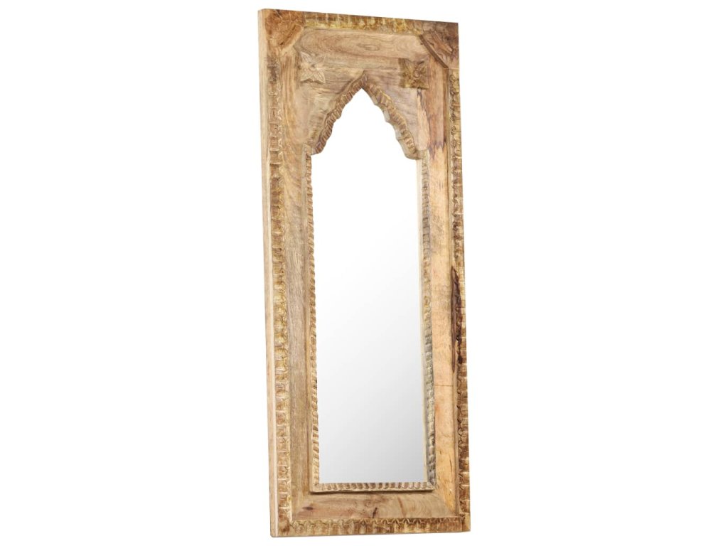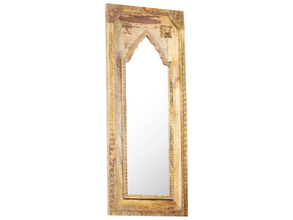 Rám zrcadla je vyrobený z masivního mangovníku, tvrdého dřeva s hustou kresbou. Masivní mangovníkové dřevo má nejen velkou nosnost, ale skvěle také odolává opotřebení a působení času. Dřevo bylo ručně vyřezáno s nesmírnou pečlivostí, což dodává nábytku větší kouzlo. Zrcadlo si můžete dát do koupelny, ložnice nebo obývacího pokoje a poslouží vám i jako kosmetické nebo ozdobné zrcadlo.