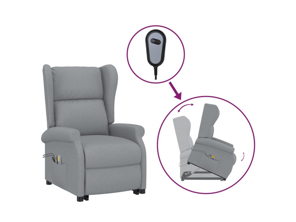 - Funkce elektrického zvedání: Toto polohovací křeslo pro seniory je vybaveno elektromotorem pro funkci zvedání. Díky funkci, která zvedá celé křeslo nahoru, můžete snadno stát, aniž byste namáhali záda a kolena, pomocí ručního ovladače se 2 tlačítky.